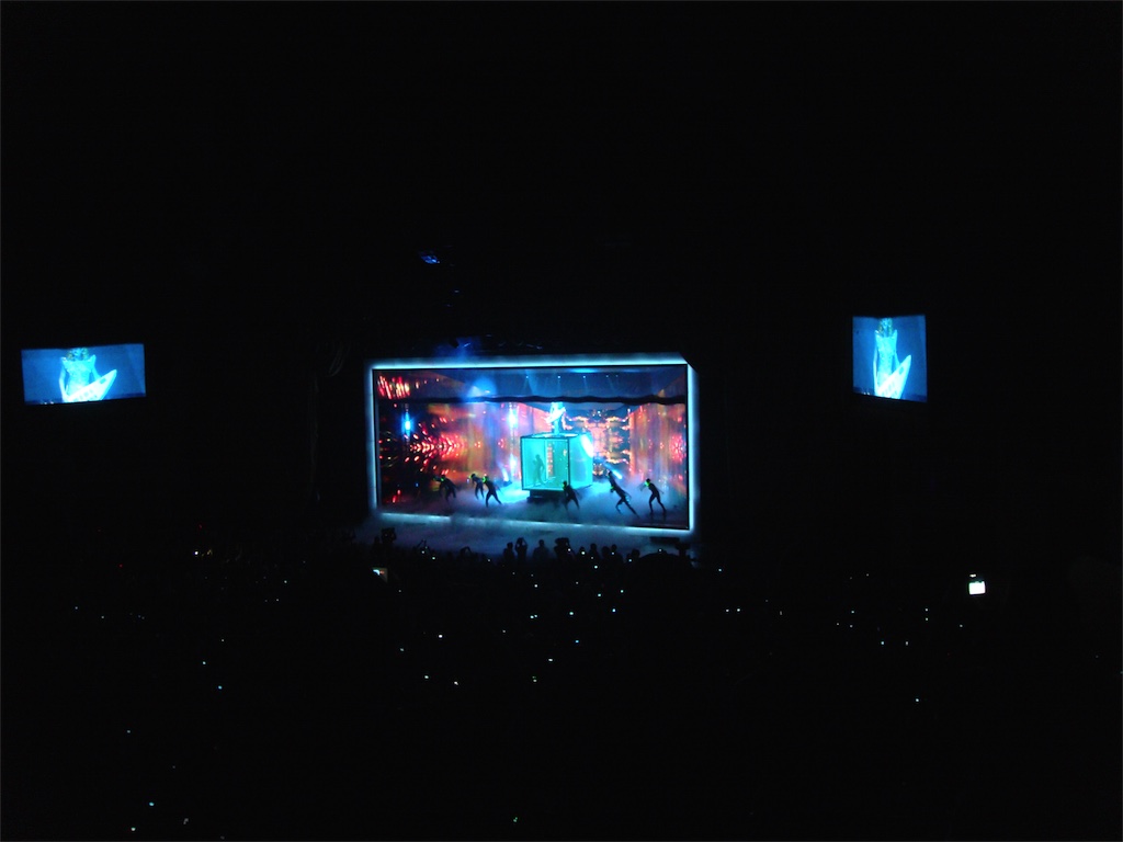 She came out on stage in a unitard that was covered in lights behind a sheer screen that was projecting a cage effect. There was a frame around the entire stage, two angled screens into the back with a television screen there too. The effect was that the whole concert looked to be set in a picture frame, a moving piece of art as you will. Throughout the concert Gaga and her dancers would come out of the picture frame, to the front of the crowd, but let me tell you, I might have been disappointed if I had been one of those crazy people to pay thousands of dollars for a orchestra pit seat.