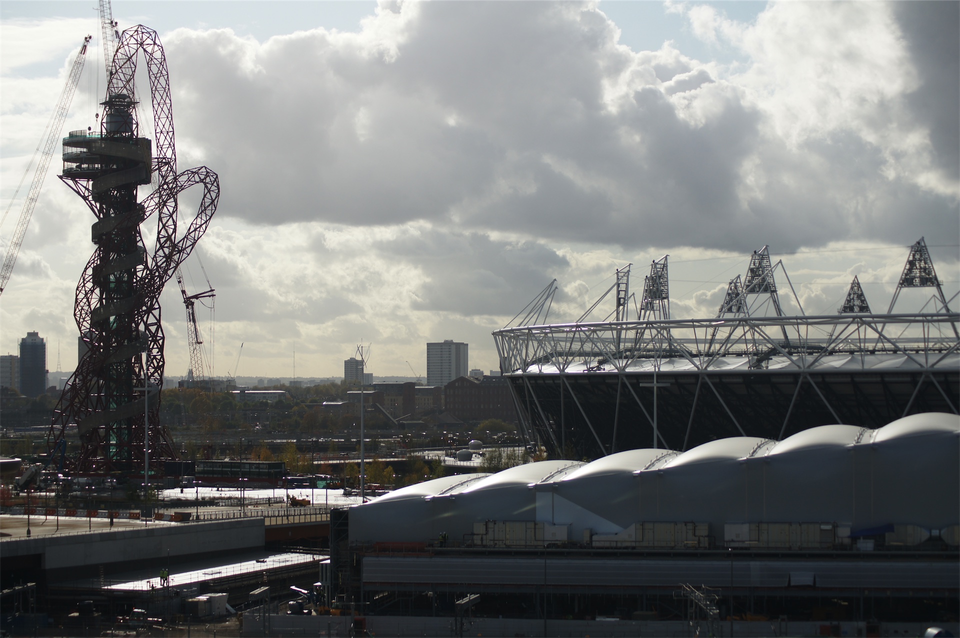 I headed out to Stratford on the Tube this morning, finally purchasing my Oyster card when I realised how much training I would have to do over the next two days. From the station you walk out into a brand new Westfield shopping centre, very swaky, kind of one long curved line with an outdoor shopping area in front. The forth and top floor is probably the most impressive as it is so high that many shops have gone for the loft effect, creating two floors of shopping goodness at the top. But I ignored that for as long as I could. I was a girl on a mission and that mission was to get the best view of the Olympic site. Shopping could, and would wait.