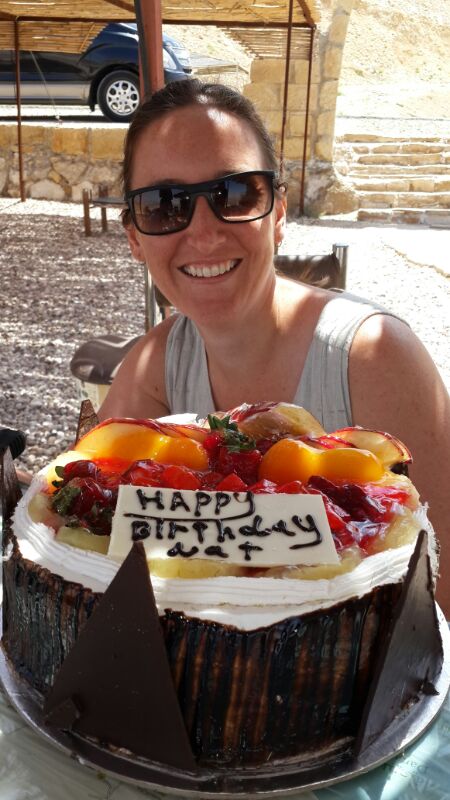 So imagine if you will a little coffee shack in the middle of nowhere with this fabulous view overlooking the countryside all the way down to the Dead Sea, a couple of brits, their tour guide and us. Now imagine in this random place your birthday cake is placed in front you and a round of Happy Birthday is being sung, just as a small famil group from Abercrombie and Kent arrive. The cake is then gone, shared amongst all the strangers who stopped by to snapshot the view. I'm lost for words to tell you how awesome this experience was so I'll leave you with two photos, one of the view and one of the huge smile on my face (and the cake).