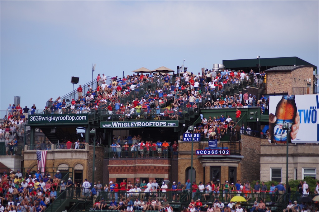 The guy outside the pub summed it up, "The sun is out, we beat Cardinals two days in a row, why wouldn't you come inside for a beer?" Well we didn't but we loved the atmosphere outside the field almost as much as inside. Wrigley is smack bang in the middle of a residential area. So much so that the apartments across the road have grandstands on top. Do I have a photo of that handy? You might be lucky here...