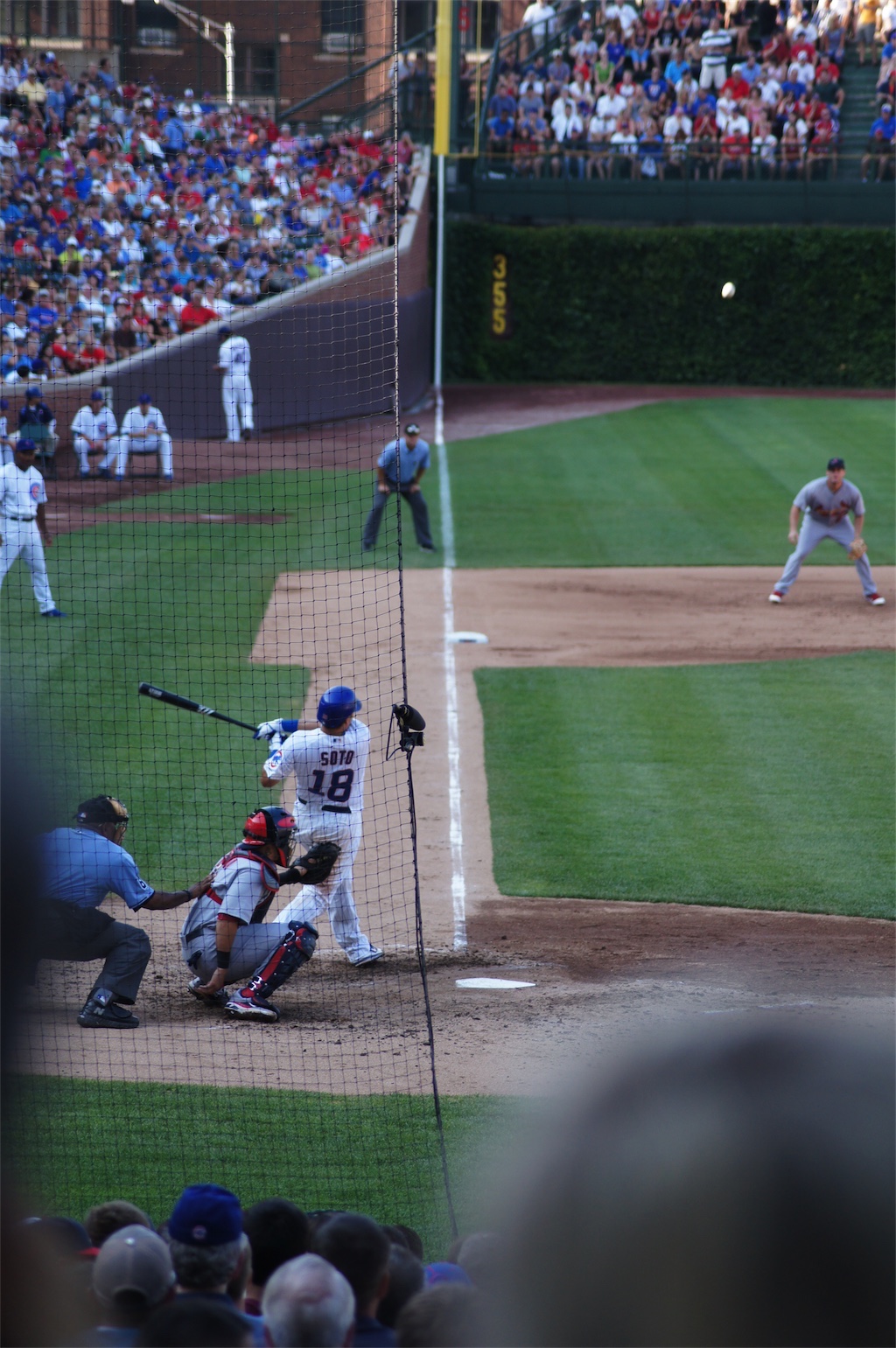 Our seats were awesome (thanks Dad!) basically in line with the foul line on the left of home plate. Did that mean we were in foul territory? Only from the right handers (and there are a lot of leftys... quite disproportionate actually) But we still got a lot of action. A couple were within a handfull of rows and seats. Others were almost directly above our heads in the upper grandstands. We saw fumbles, catches, balls hitting knees and dropping to the ground to be scavenged up. There might not have been much action on the field but they kept us guessing where the next foul was going to end up. Seriously one cub player hit four foul balls into the stands in one turn to bat.