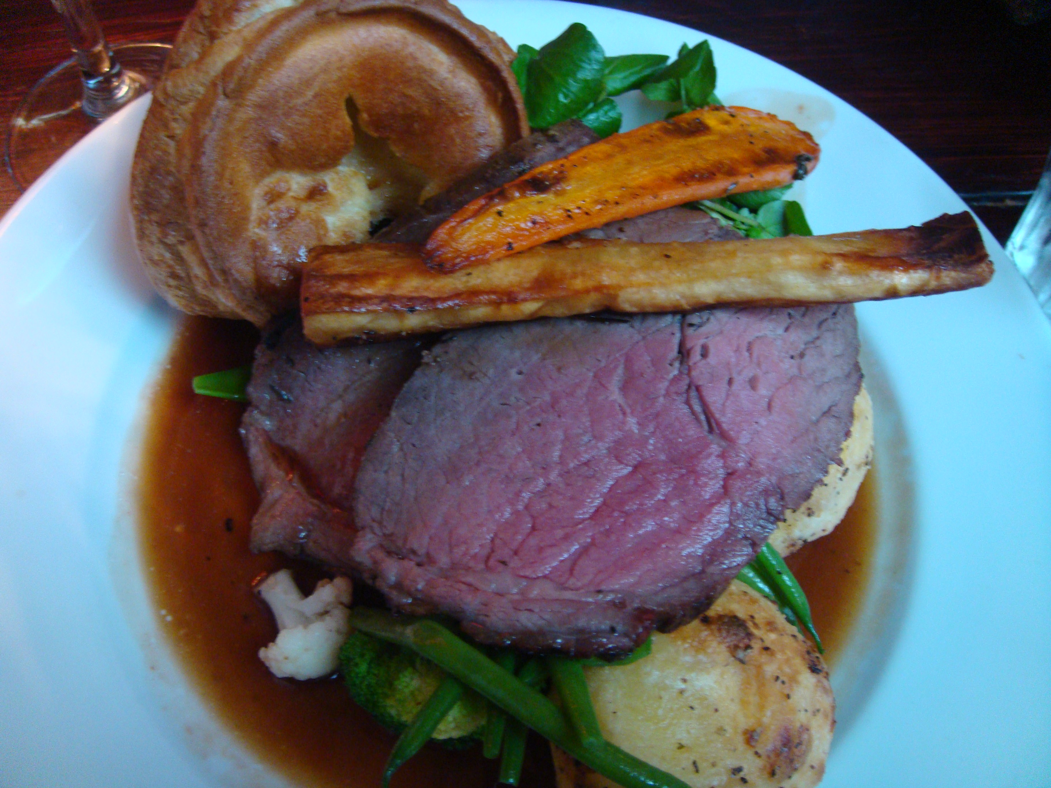 Dan promised us a Sunday roast and that is exactly what we got. Beef and Yorkshire pudding stacked on the plate thusly.